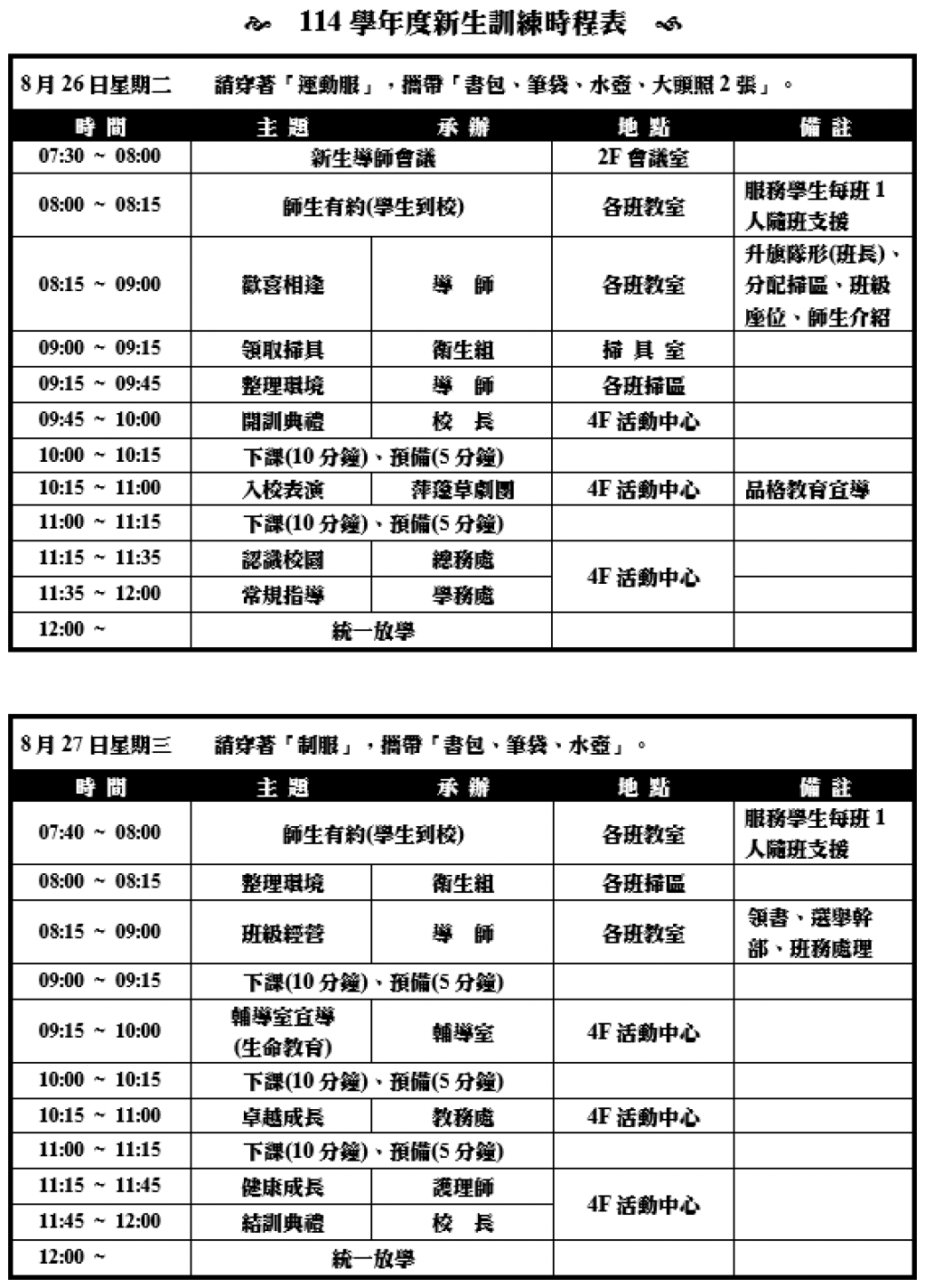 8月26、27日114學年度新生訓練行程公告(新增服裝公告)。