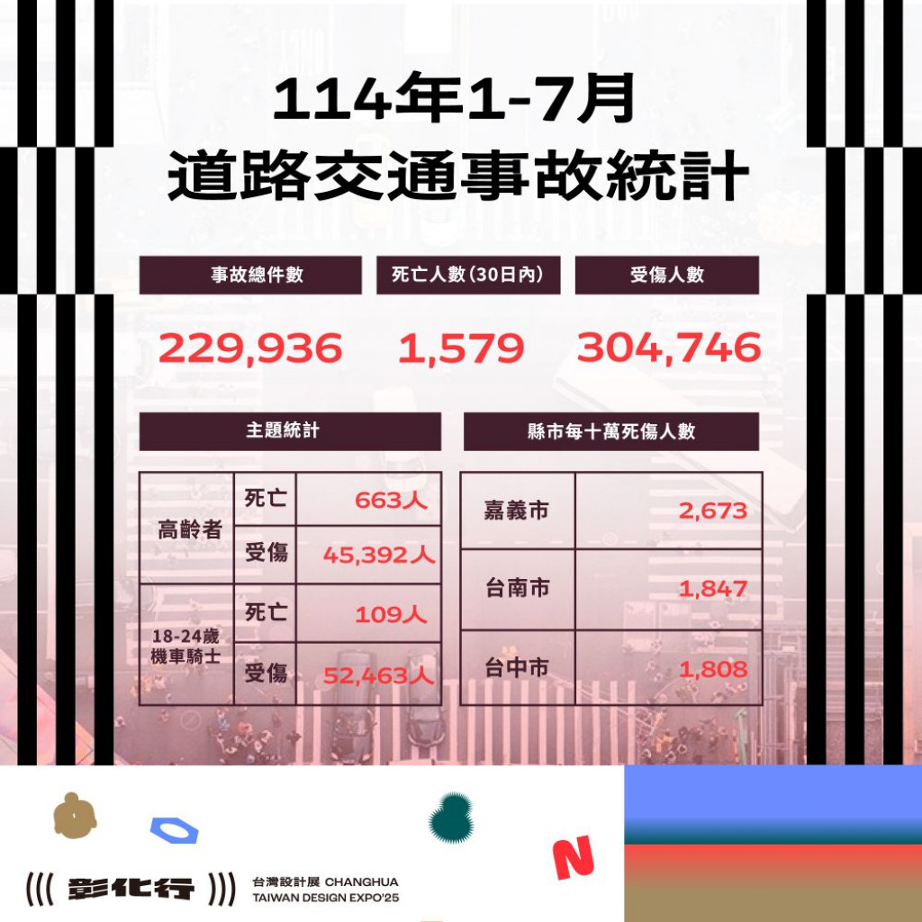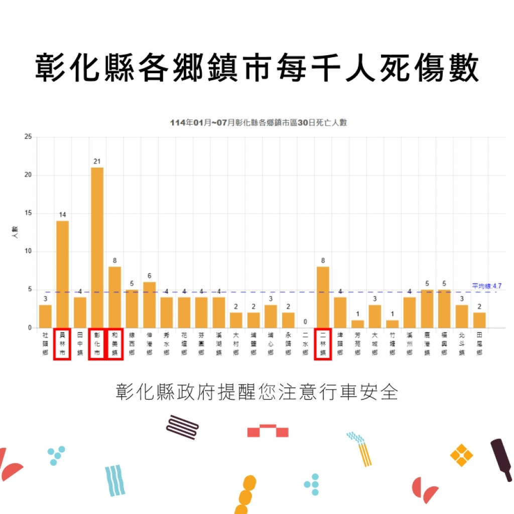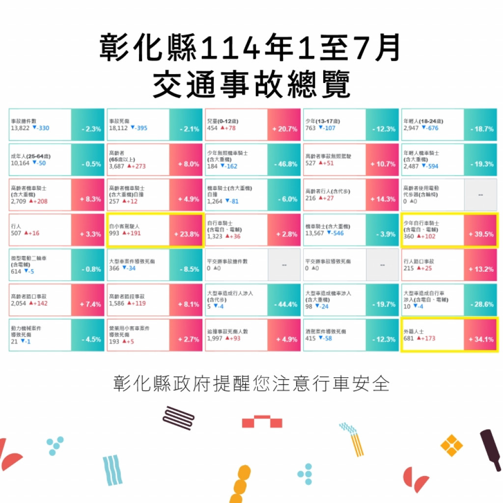 根據交通部道安資訊查詢網統計快覽數據跟112年同期比較分析,以少年自行車騎士(含電自、電輔) 事故增加39.5%最高,外籍人士事故增加34.1%次之,自小客車駕駛人增加23.8%再次之。1-7月份30日鄉鎮市每千人死傷人數於「彰化市、員林市、二林鎮、和美鎮」為多,肇事熱點以「彰化市」為多,合先敘明。