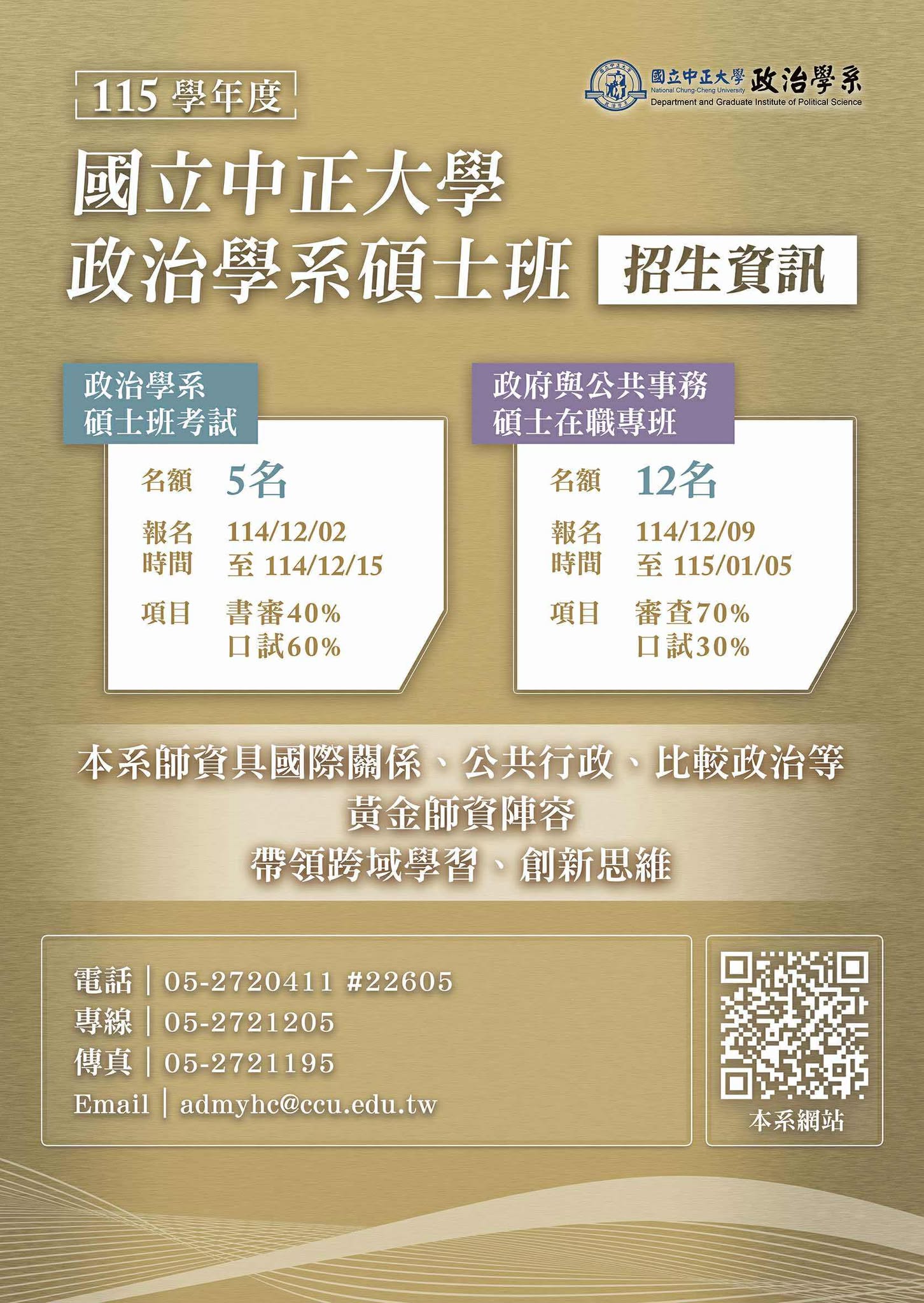 轉知國立中正大學政治學系115學年度政府與公共事務碩士在職專班招生考試資訊,報名日期自114年12月9日起至115年1月5日止