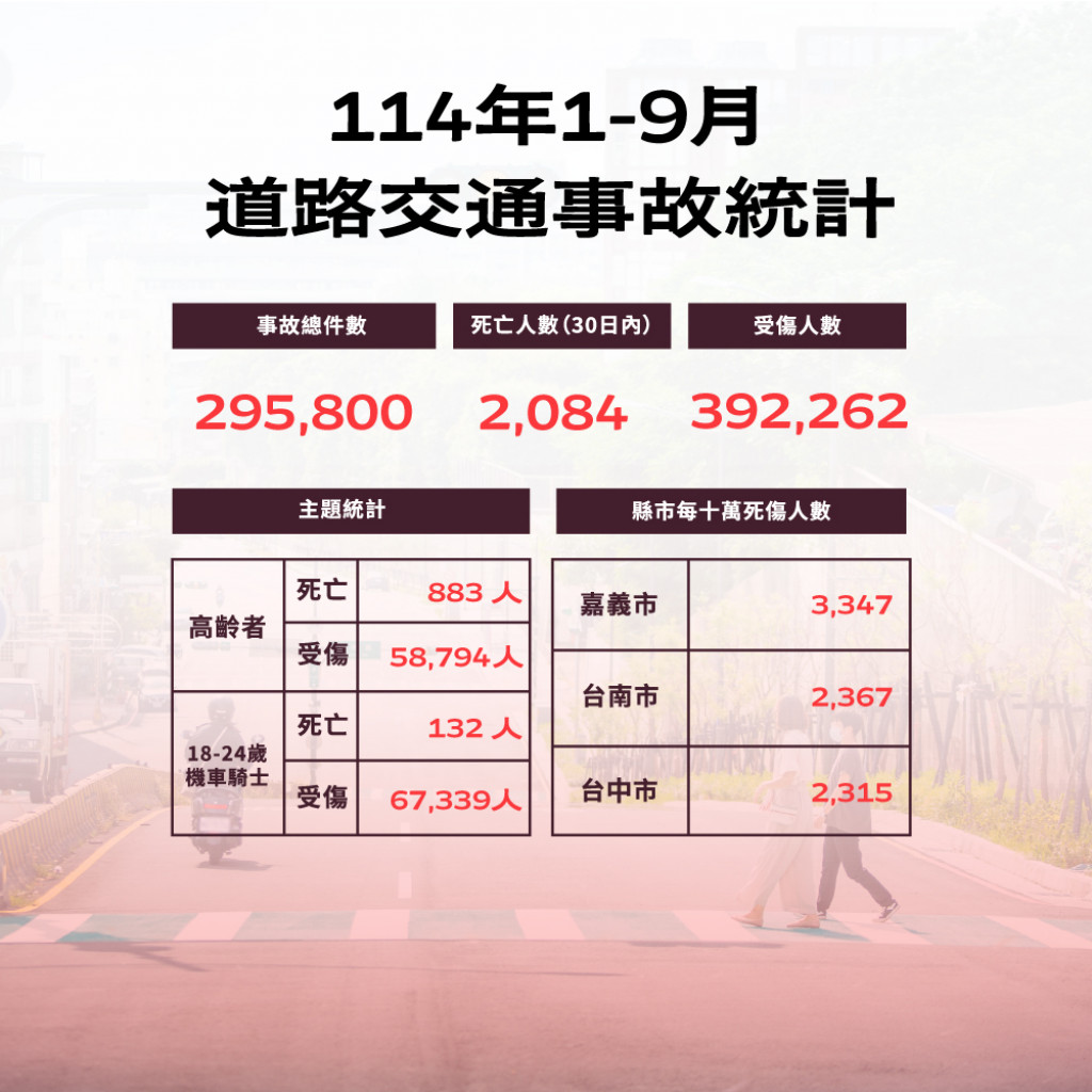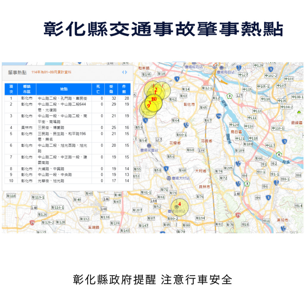附件為「114年1-9月全國道路交通事故統計、彰化縣交通事故死傷人數增加排行、本縣各鄉鎮市30日死亡人數、肇事熱點及交通事故肇因統計」共5份統計資料宣導圖,社群宣導內容可參閱或分享本處「花現彰化-彰化縣政府新聞處」(https://pse.is/8h44cp)臉書粉絲專頁,相關宣導圖片素材請參閱:https://reurl.cc/DbyGR5。