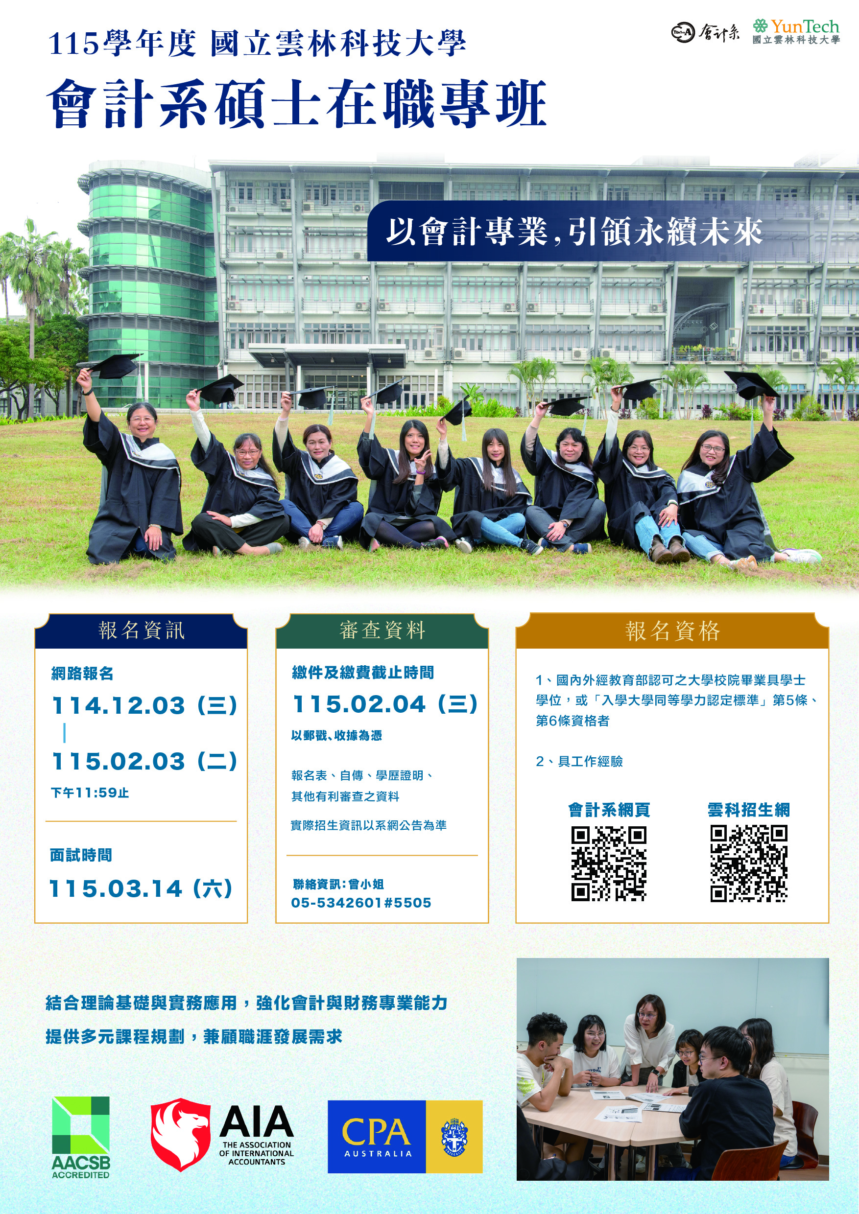 | 一、 | 會計系碩士在職專班招生網路報名時間:即日起至115年2月3日(二)下午11時59分止(一律採網路報名)。簡章下載及報名網址:https://examweb.yuntech.edu.tw/WebExams/Exam_W/ |
