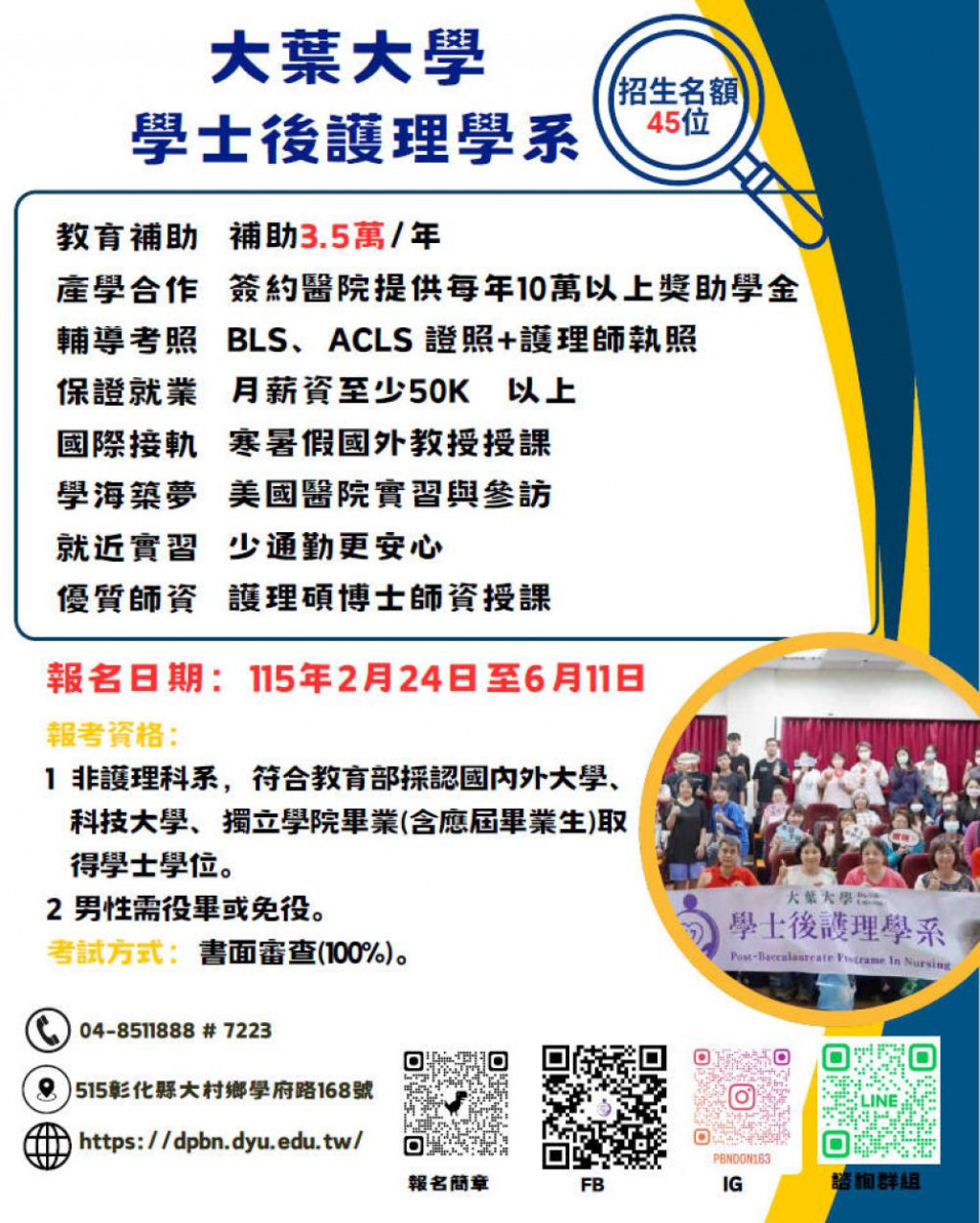 檢送大葉大學「115學年度學士後護理系」招生資訊與海報,鼓勵同仁、具學士學位學生及應屆畢業生踴躍報名。