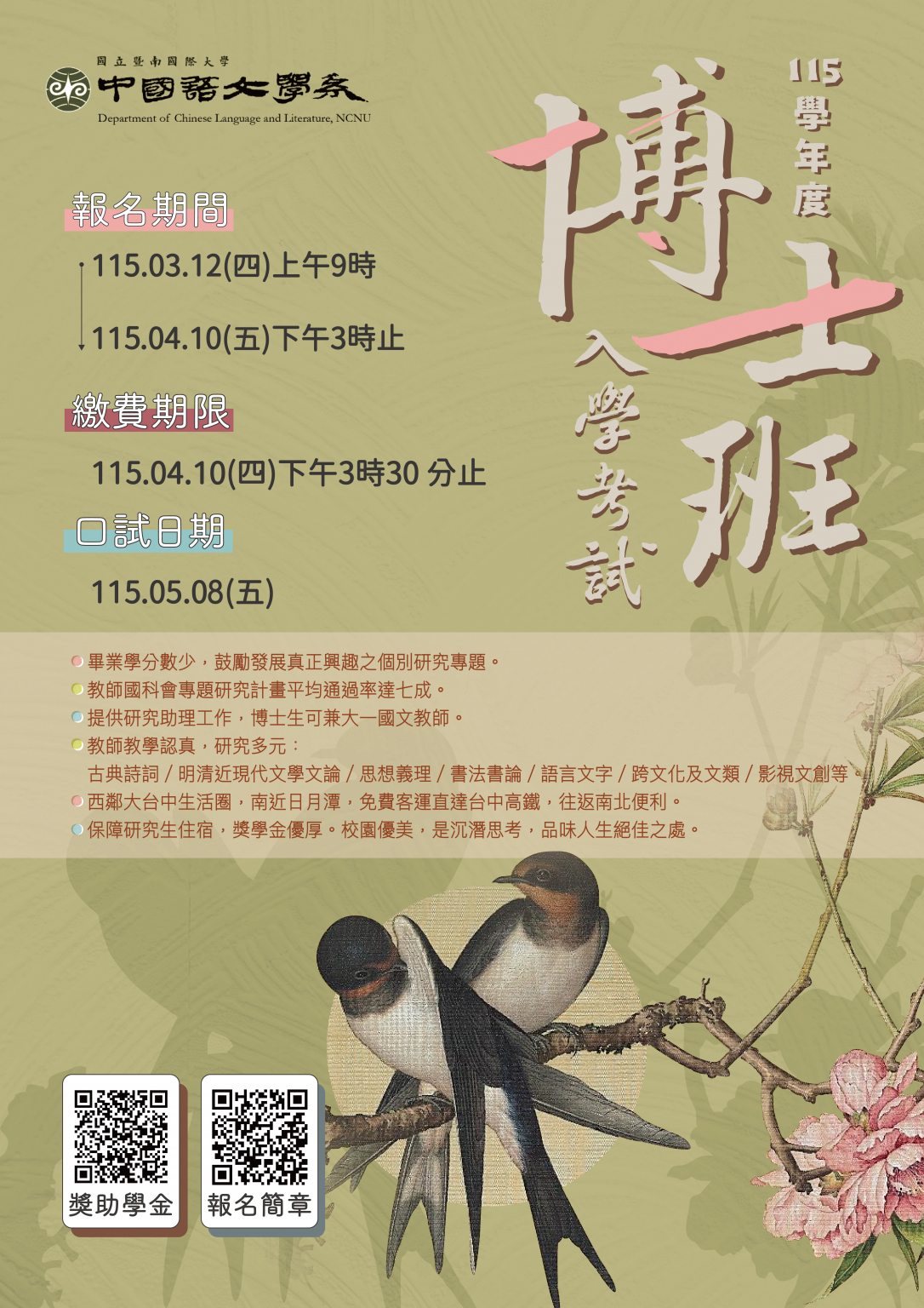 轉知國立暨南國際大學中國語文學系115學年度博士班入學考試開始報名,檢送招生海報電子檔